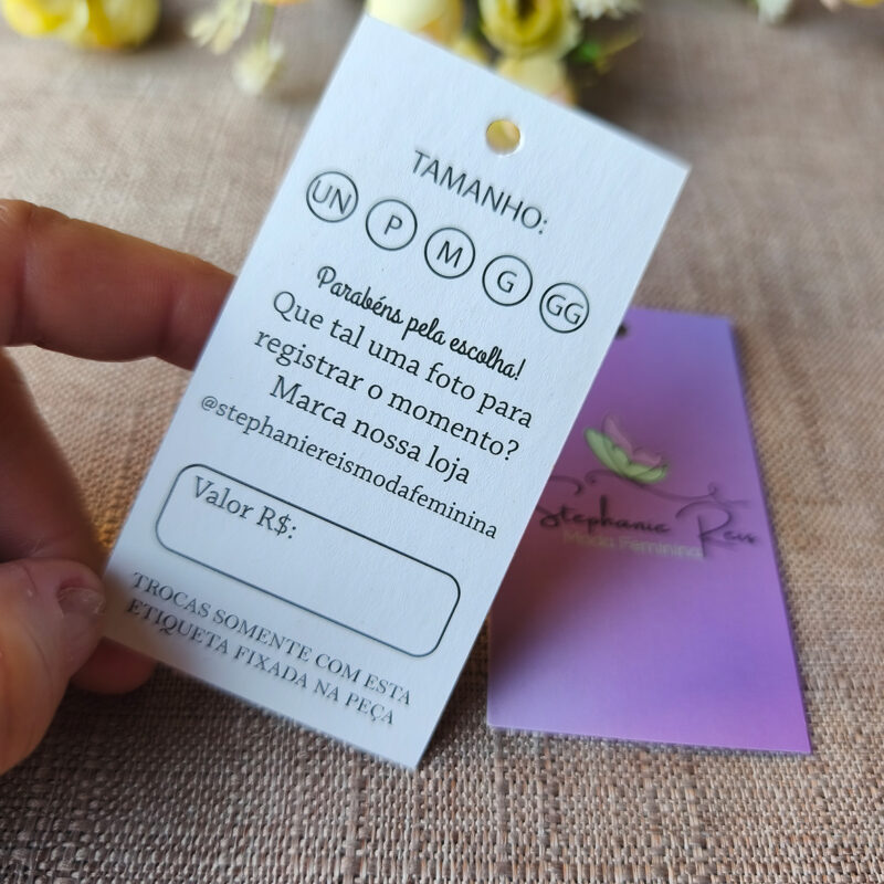 Destaque sua marca com nossas tags de roupas personalizadas! Produzidas em papel de alta qualidade, as etiquetas são ideais para confecções, lojas de moda, artesanato e empreendedores que desejam transmitir profissionalismo e identidade visual em cada peça.✨ Personalize com logo, cores e informações da sua marca ✨ Ótima para roupas femininas, masculinas, infantis e moda fitness✨…