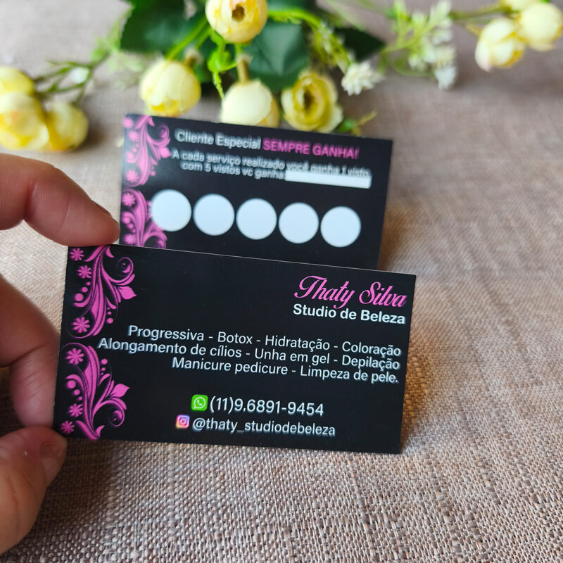 Encante seus clientes com o cartão de visita com acabamento em verniz localizado personalizado. Esse modelo une sofisticação e impacto visual, destacando detalhes importantes como logo, nome ou elementos do design com um brilho exclusivo que chama atenção. Produzido em papel de alta qualidade, com impressão frente e verso colorida e acabamento premium. ✅ Impressão…