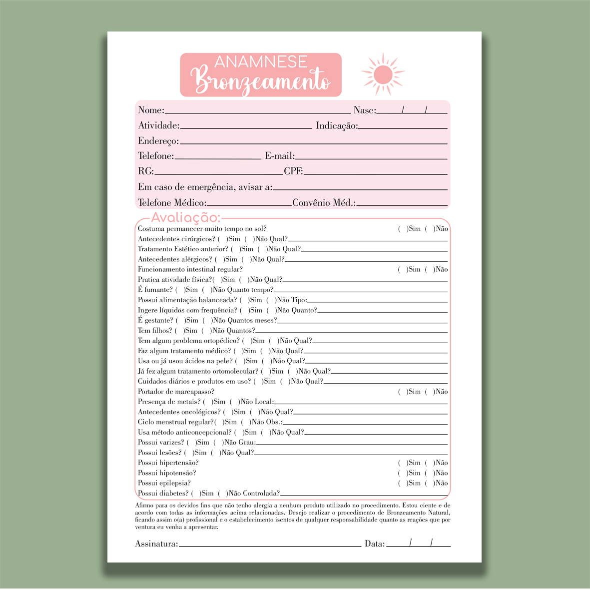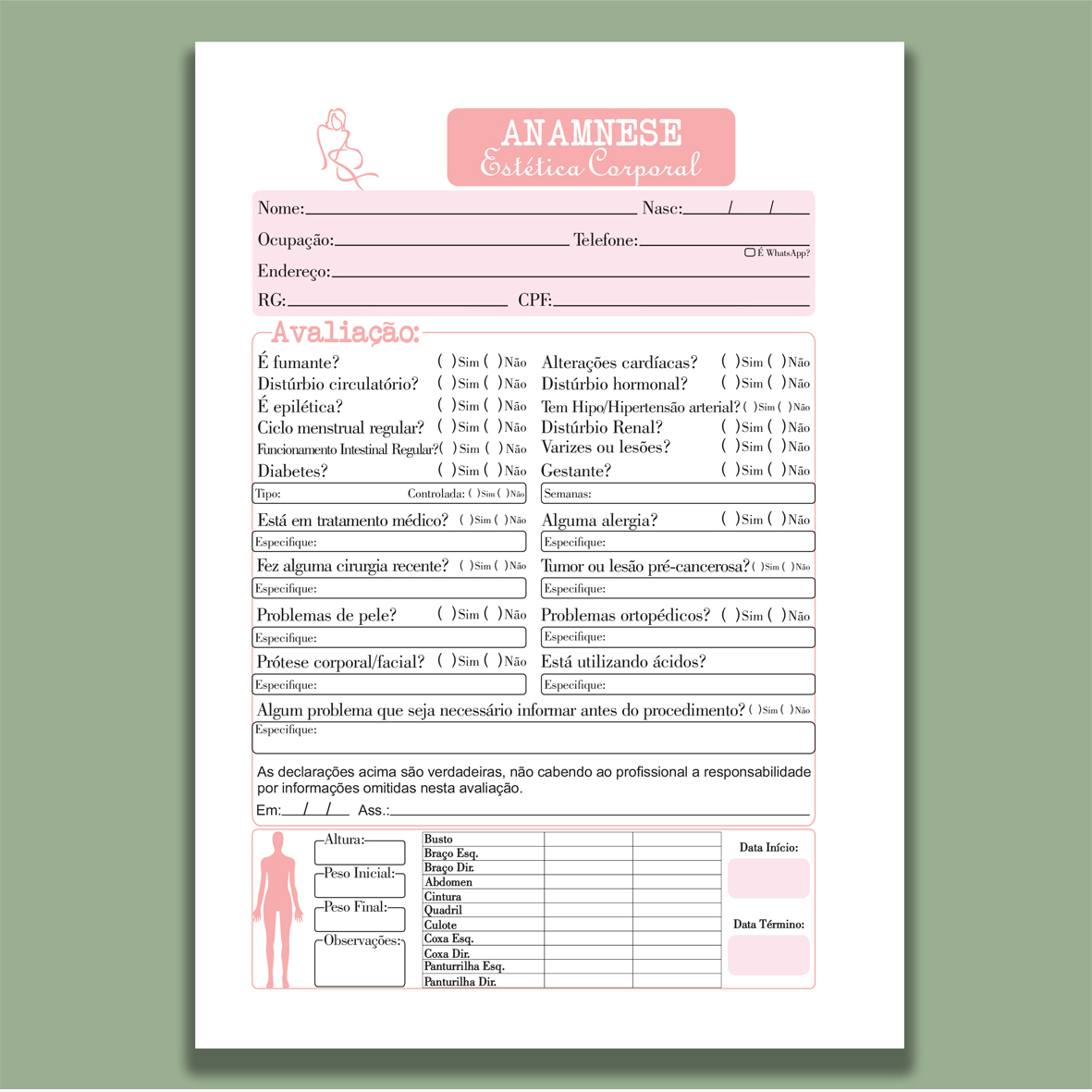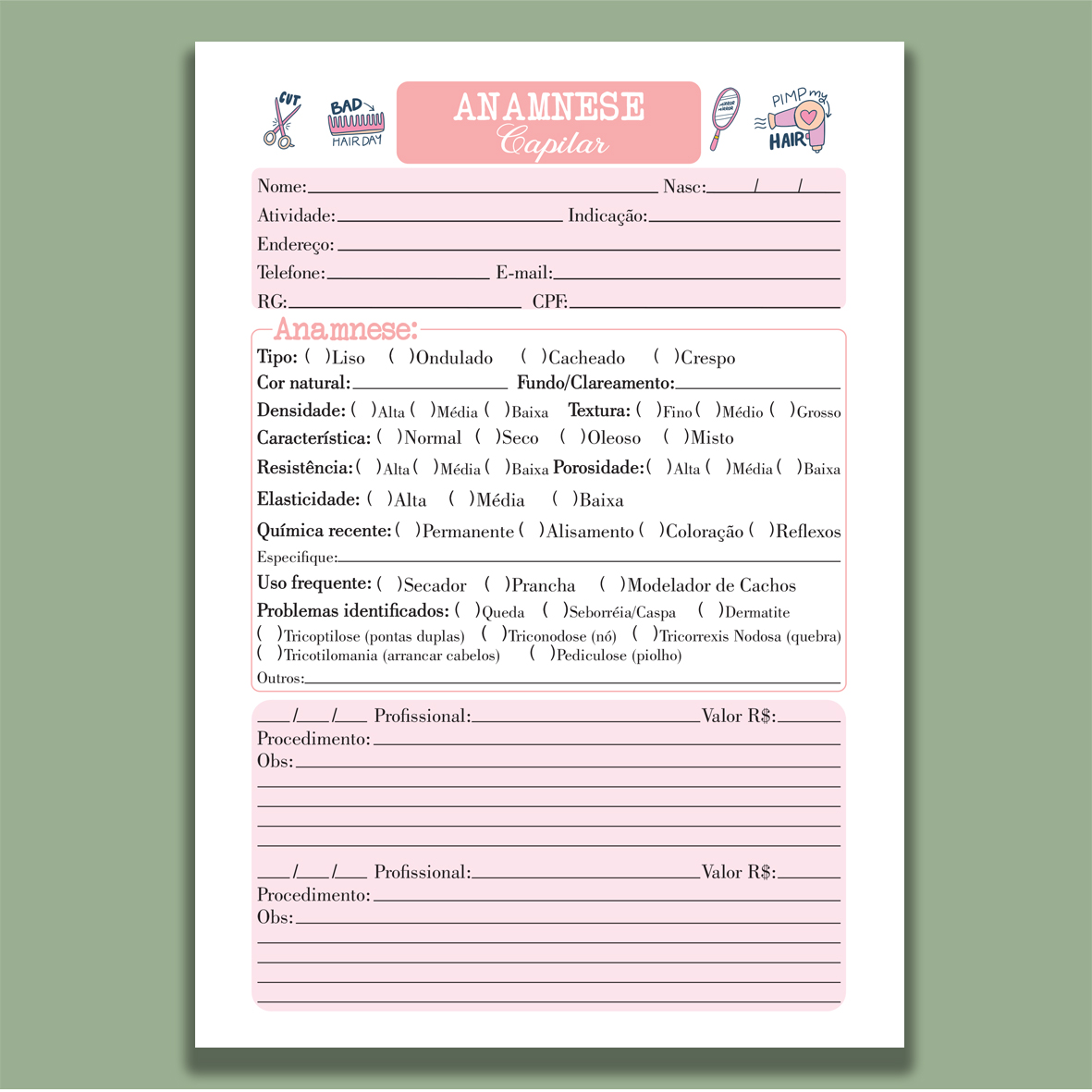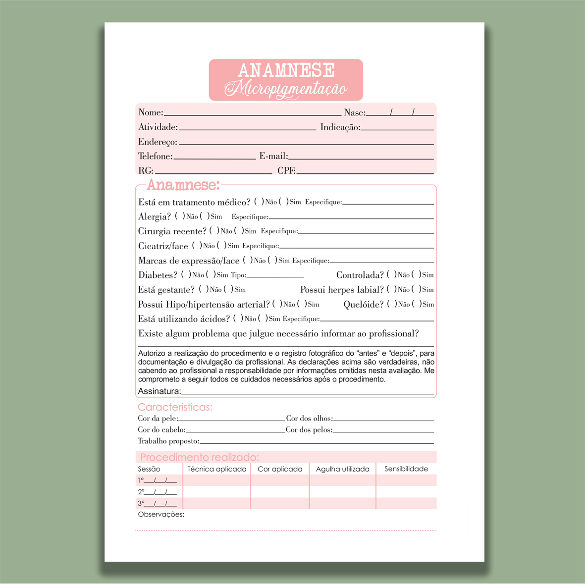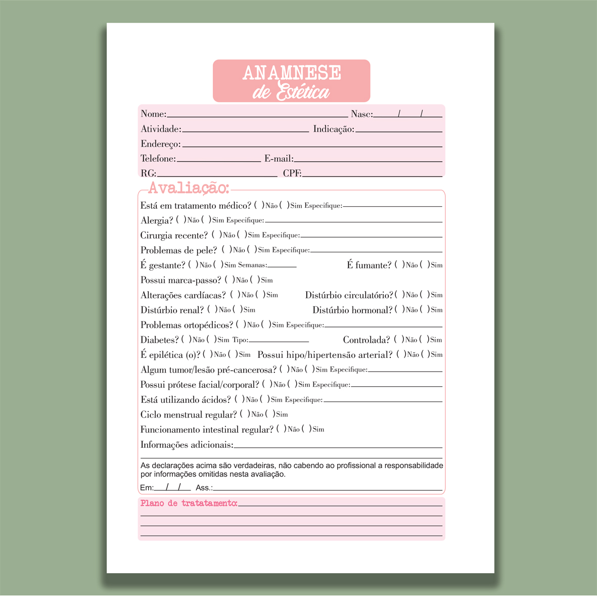 Organize suas consultas com praticidade e profissionalismo usando nosso bloco de anamnese encadernado. Ideal para consultórios, clínicas, estúdios de estética, fisioterapia e outras áreas da saúde, ele garante registros claros e seguros das informações dos clientes ou pacientes.
