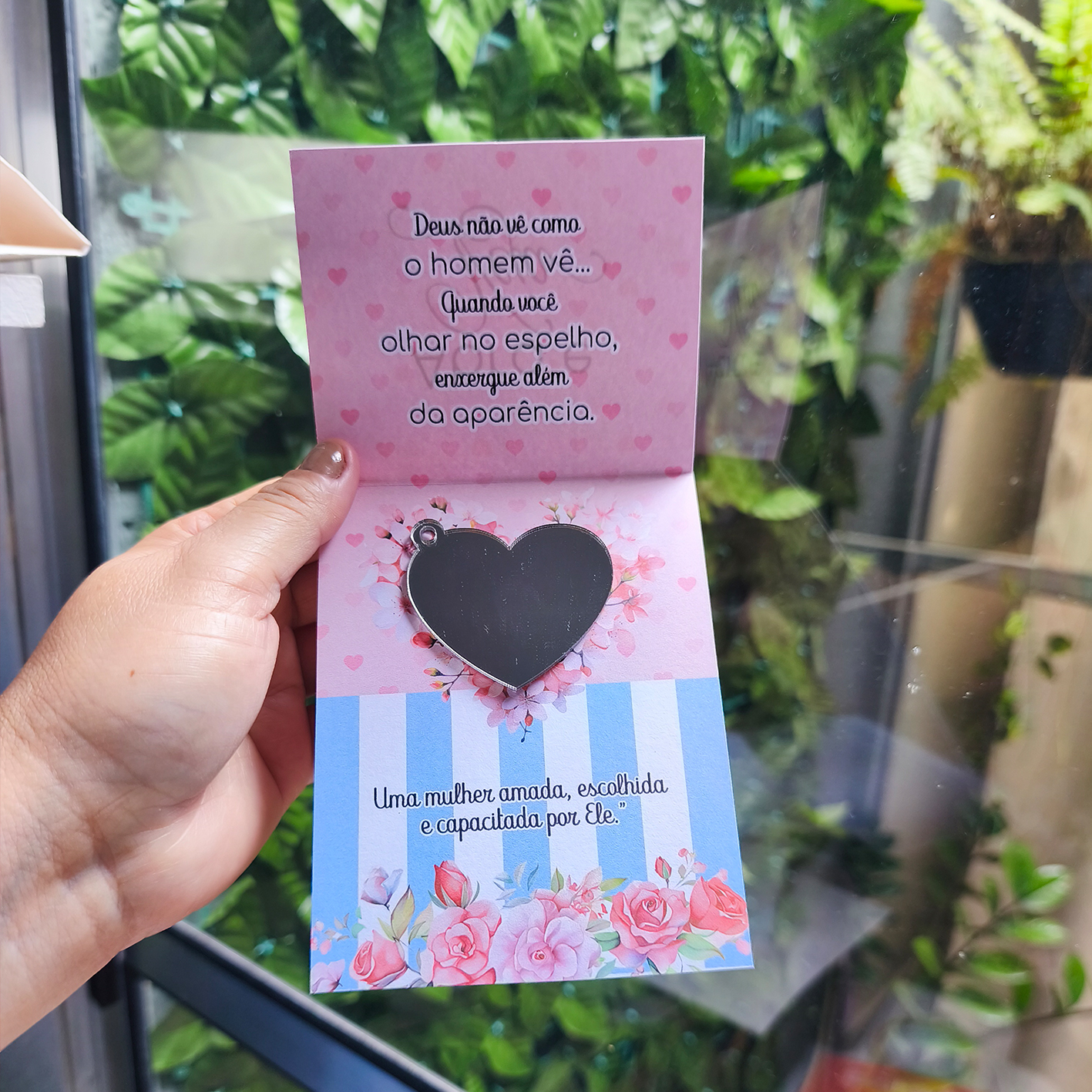 - Chaveiro de Coração: O chaveiro, com 5 cm x 5 cm, é feito de acrílico resistente e tem um formato de coração, que representa carinho, empatia e a valorização da vida.